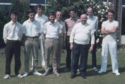 Two photographs are attached, which you are welcome to add to the collection on the website. One shows the 1970 or 71 staff 2nd cricket team, which I presume played a pupil 2nd team. Back row: unknown, Squadron Leader T. L. Thompson, Mr. Birch (?), Alastair (Big Al) Summers.