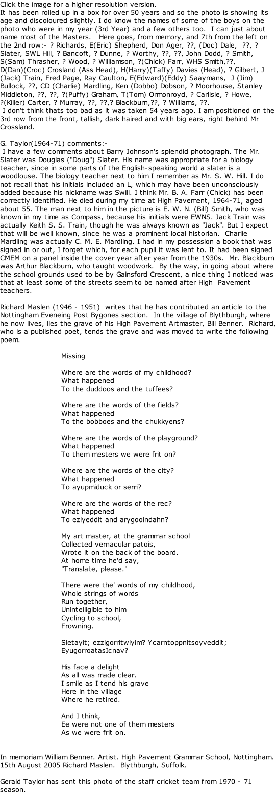 Others... Beaky Billington, "Albert" Brown (although I seem to remember always referring to him as "Ma" Brown), Ray Coulter (?) (Woodthorpe house master), Pete Aldwincle.