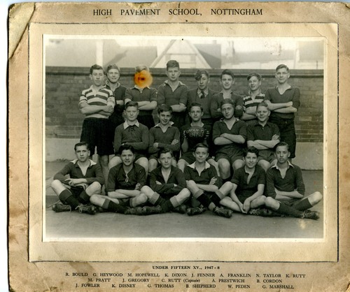 I was a pupil of High Pavement from 1952/3? till 1960. I had I believe one or two years or at the old victorian school which I remember well. My first year was in one of the older buildings across the road from the main hall. The second year the classroom was a temporary building in the same area. I particularly remember we had no playing field and were bussed to Strelly for rugby. We also had to walk over the hill to a an old chapel which was our canteen. It was awful as was the food, brought in and heated up.