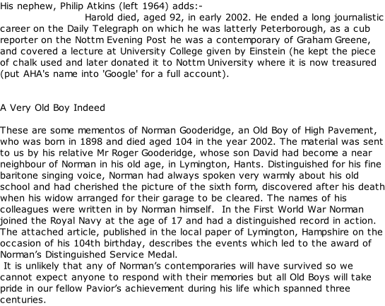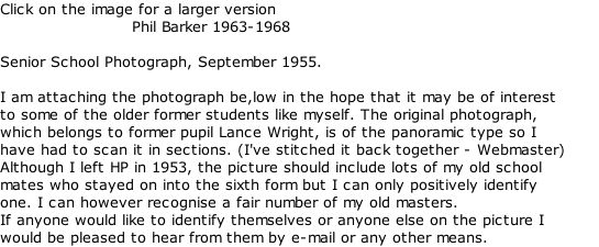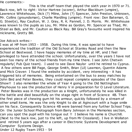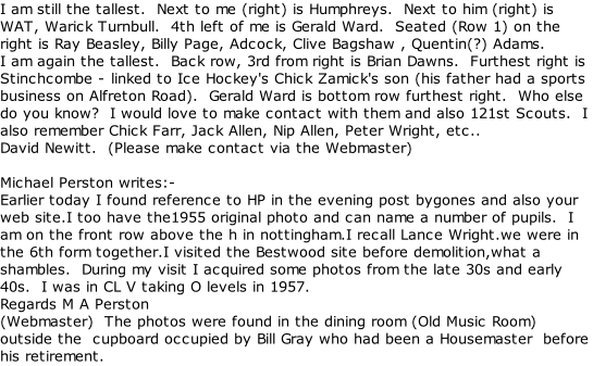 Finally, Lance Wright writes: I remember my encounter with Stan Middleton on my first day at HP, He selected myself and a friend called Handley to carry a double bass in its case from the school to his house in Sherwood, more than a mile away. It was an unusual introduction to music in the school.