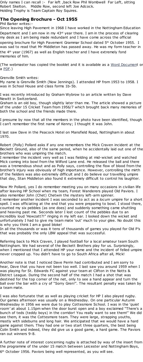 Regarding the High Pavement on video, you asked if anyone remembers Russell Munn, Paul Belshaw, Vince Quinn and David Rydeheard. Well they were all 1966 starters and in my class (designated P). I was at HP from 1966 to 1971 although some of those lads would have stayed on until 1973 for A levels. Alex Rae will also remember those names. Other boys in the P form were Howard Hewitt, Pete Sadler, Paul Dudley, Clive Swinn and Neil Faulconbridge. Alex will remember many others but I'm afraid my mind has gone a blank!