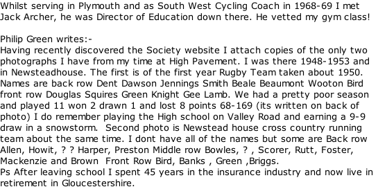 I was just looking at the HP Society website, and saw references to Jack Archer, and also a former pupil named Stinchcombe. Jack Archer was not only a pupil at HP, but he also returned to the school in 1946 to do a period of teaching practice (I was in the 3rd form at the time). That year he became the European sprint champion. Two years later he was a member of the silver-